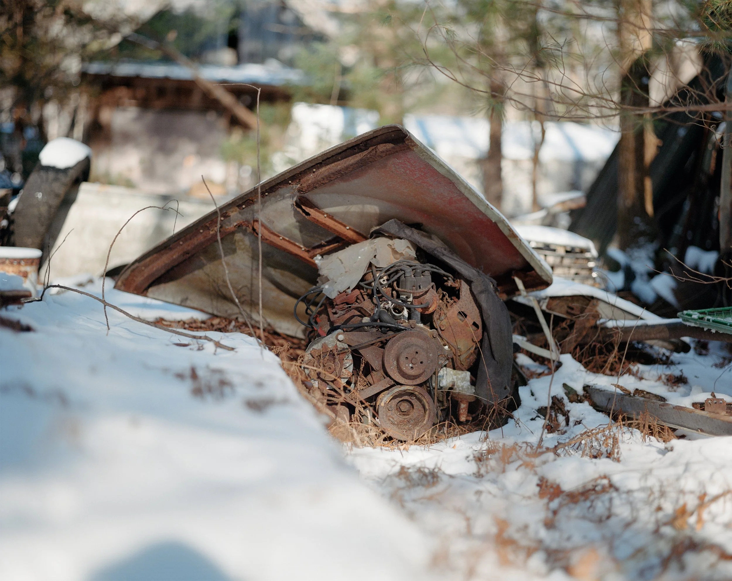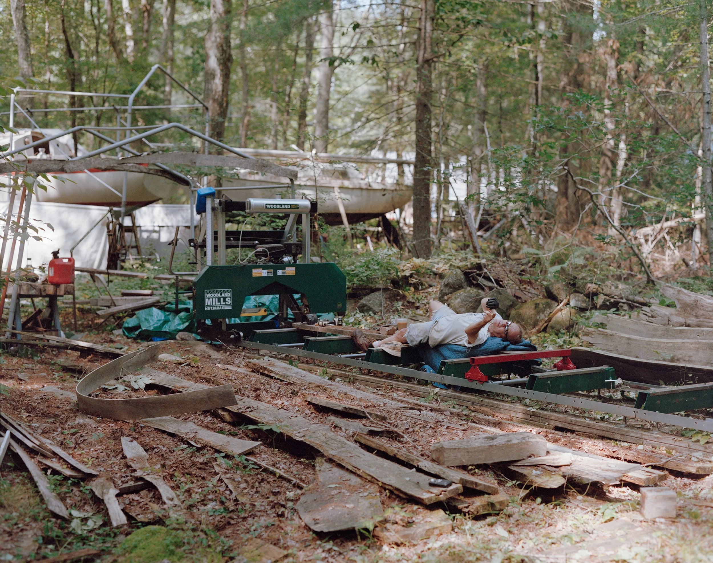 PSG: It always makes me laugh when people think that maybe it was already set up like that, but it totally makes sense. And it could be. When I think about how the property is organically, it definitely already has sculptural potential. My dad is very careful in some ways about how he arranges his things. Those images were constructed mainly by me. The color series developed from a sub-project of Bad Dogs called What We Build that my dad and I were undertaking while I was in undergrad, so 2013 to 2016. I was very intentionally going home every weekend and we would build a sculpture out of materials on the property. I would document the finished piece with whatever camera I was learning. So there's some Hasselblad images, there's 6x7 film, there's some digital, and some 35mm film pictures, and I also filmed us assembling each sculpture. Afterwards I filmed us very intentionally deconstructing each sculpture and returning everything to where we found it.