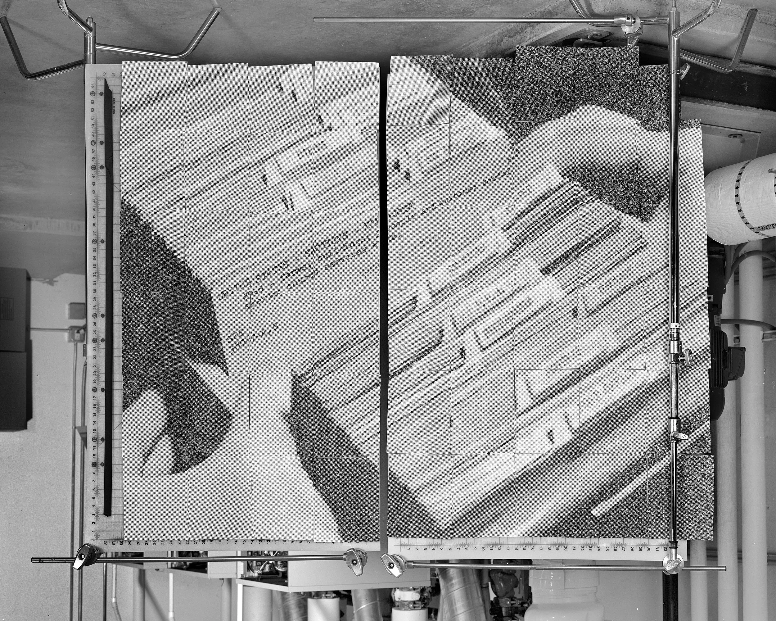 After graduate school I started teaching full time. My course load included digital and film photography. Teaching B&W film photography made me jealous of my students working with film and made me realize I could synthesize my interest in still image(s), collage and a studio-based practice more organically by eliminating color from my practice, using film and expanding the size of the negative. In the present, I am concerned with how photography relates to production and reproduction as a synonym of propaganda, which is in part a reason why film is an important medium. It allows for endless reproductions to be created, altered and recreated to suit the needs of the user(s).