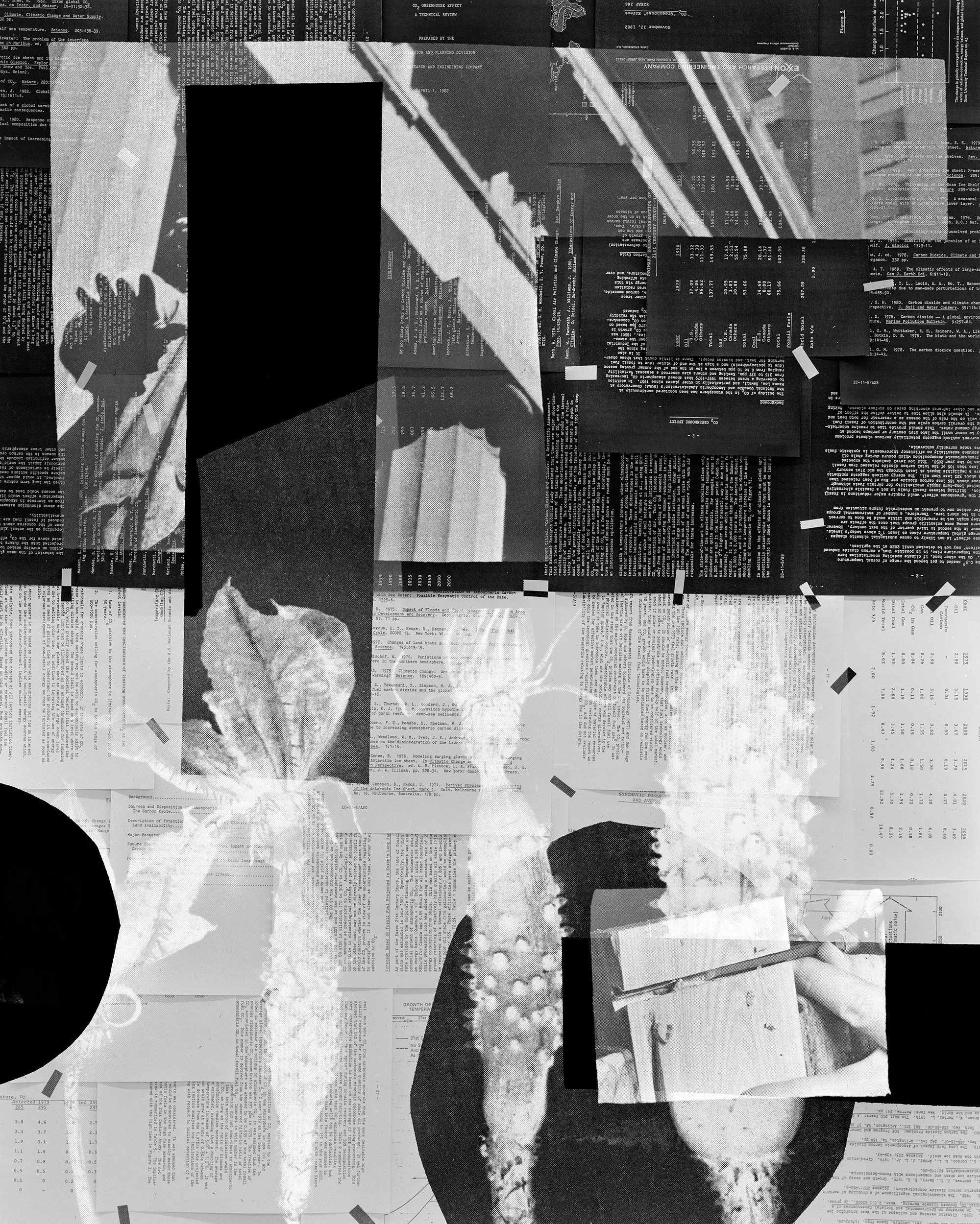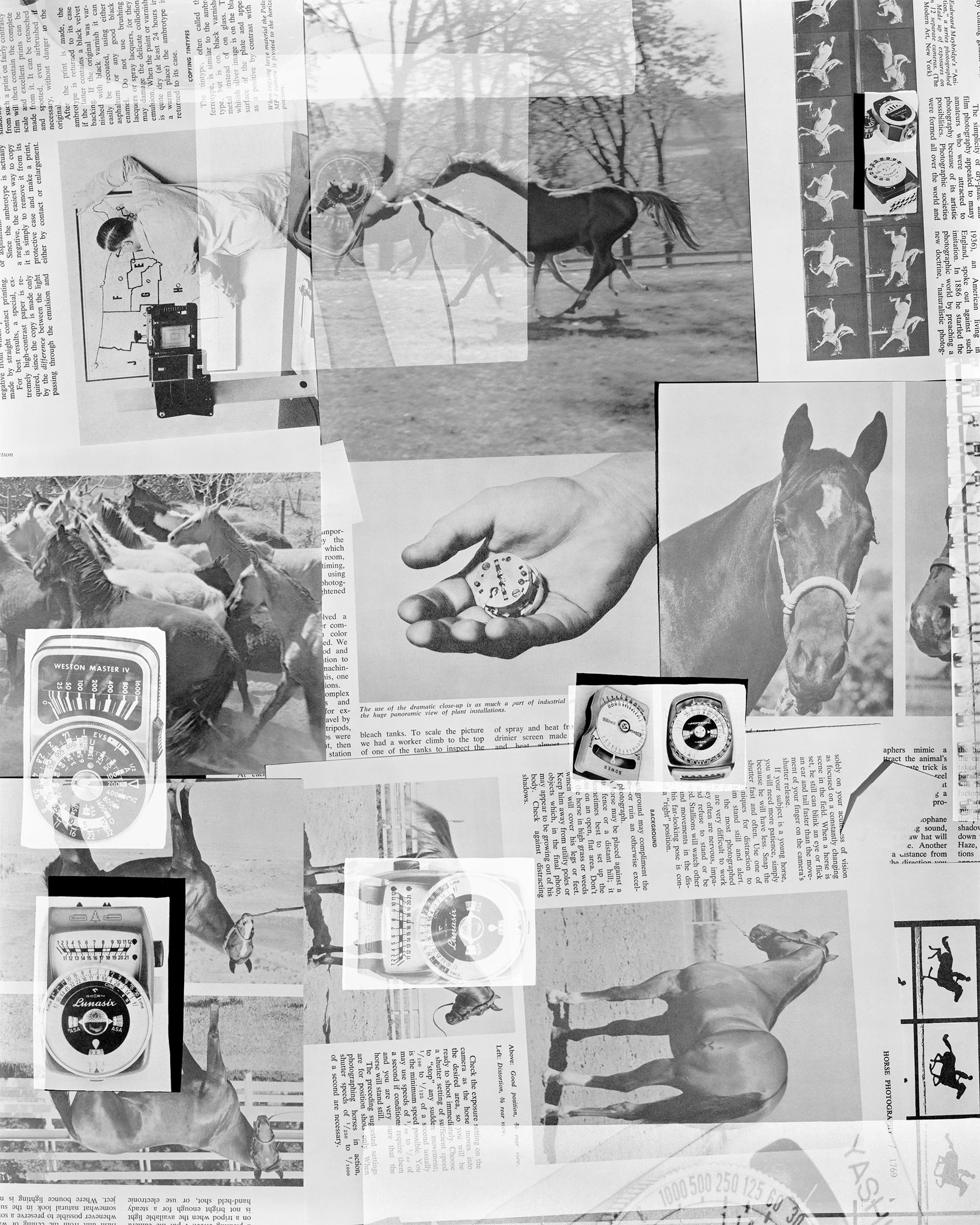 SB: I'll make a design in Photoshop with pictures that I take of my phone, either in the studio or landscape and juxtapose them with images from the archive. I'll print that design out, cut out the shapes of images and masks, then trace them onto paper and foam. Foam gets placed onto the film holder in the dark as a reference to where paper masks will be applied, then paper masks are taped onto the negative through the holes. Foam masks are then taped into the camera behind the ground glass. A section of the collage gets exposed, a mask gets removed, a mask gets added, then repeated over and over again.
